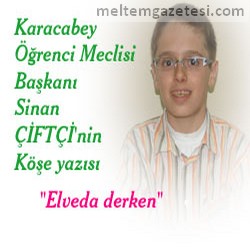 Sevgili okuyucularım; Bu yıl sizlere Meltem aracılığıyla onlarca yazı sundum. Yazılarımı dikkatle okuduğunuzu umuyorum. Ancak, bu yıl 8. sınıf yani OKS öğrencisi olduğum için boş zamanlarımı derse ayırma kararı aldım. Yazılarıma bu yoğun ders yılı nedeniyle ara vereceğim. Eğer yazabilirsem de çok nadir karşınıza çıkacağım. Köşemi HÜSEYİN TAŞÇATAN’A bırakıyorum. Bu yıl iyi bir liseye gitme hakkı kazanabilirsem, sizlere söz veriyorum “Günlük Yazılar” yazacağım. Beni anlayışla karşılamanızı istiyorum. Üzülerek, sizlere veda etmek zorundayım. Bu, “Artık Sinan hiç yazı yazmayacak” demek değildir. Sadece zamanımın %90’ını derslere ayırmak ve okumak istiyorum. İleride karşınıza üniversite mezunu, ülkesine yararlı aydın bir yönetici olarak çıkmamı istiyorsanız, beni gayet iyi anlıyorsunuz demektir.
